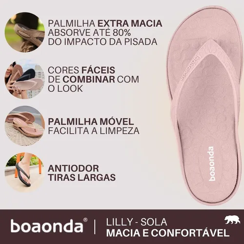 Boaonda: conforto que faz diferença no Amigo Chinelo Quem busca conforto absoluto costuma se encantar com os modelos da Boaonda. O campeão de vendas na Sandaliaria Maringá é o Lilly, um chinelo ortopédico muito procurado por quem cuida da saúde dos pés. Isso porque sua palmilha tem a tecnologia Maxisense, que amortece até 80% do impacto da pisada.